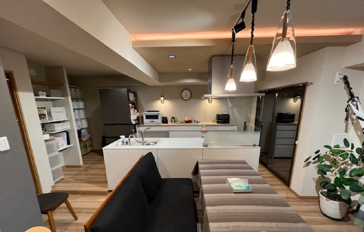 キッチンとの壁を取り払いアイランド型キッチンをリビングと繋がるように配置